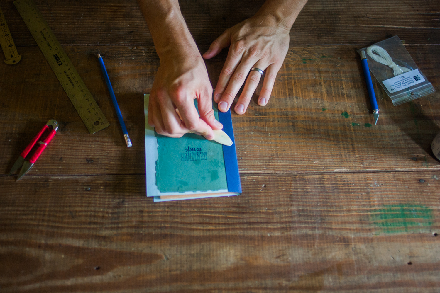 Next, I measure the spine and used the bone folder to score folds for a spine-width section into middle of the paper.