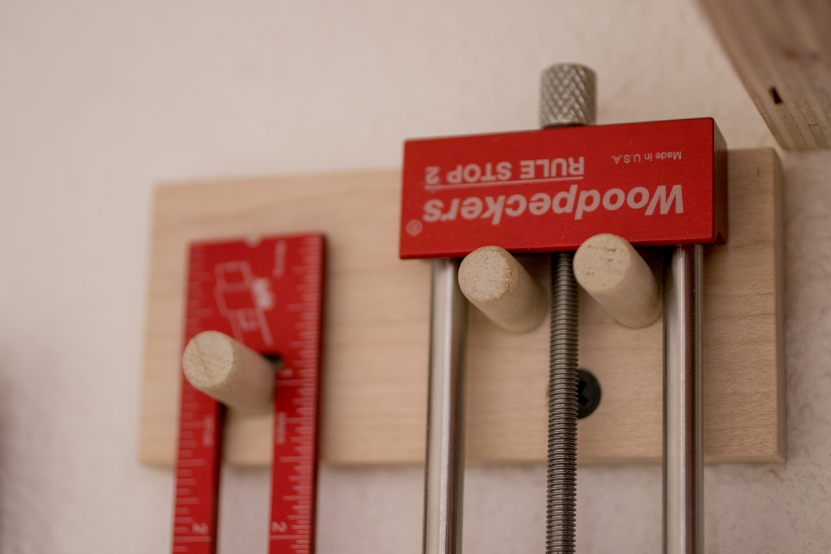 Some smaller, lightweight tools got a little hanger made from some of the leftover scraps and 3/8″ birch dowel I had lying around.