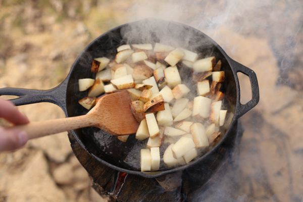First toss in a large spoonful of bacon fat. You’re camping, treat yourself! Let the skillet heat up. Toss a small drop of water in the oil to see if it’s up to frying temp. If it spits and crackles it’s ready.