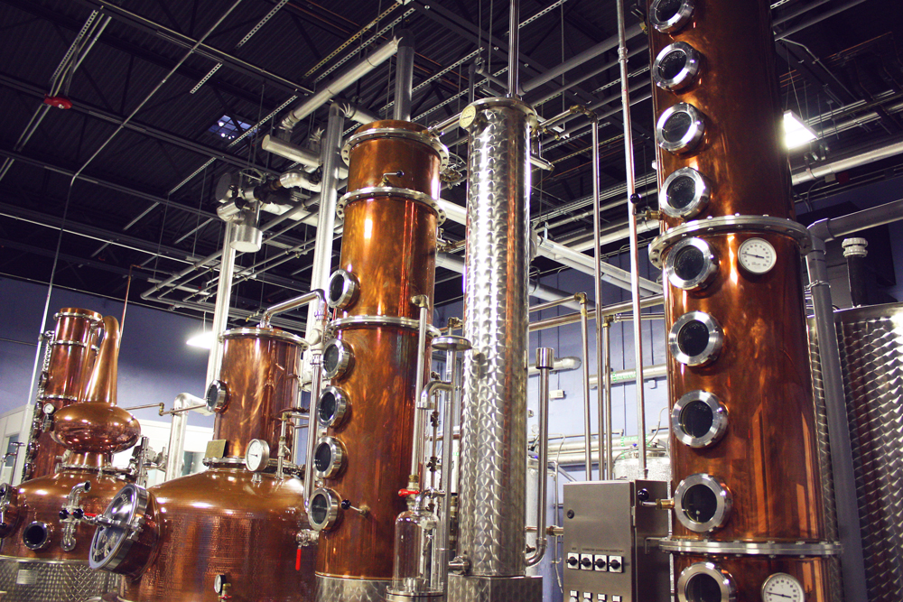Next, the stills. The liquid is heated and turned into steam where it condenses at different stages by hitting metal plates inside the still. You see those little windows on the vertical portion of the still? Each one is a distilling step – removing impurities with every stop.